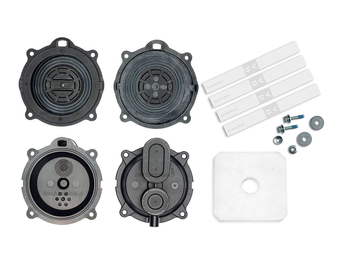 Zestaw naprawczy do SECOH EL-S-120W. Komplet składa się z gumowych membran (2 sztuki), filtra powietrza, obudowy membran z zaworkami (2 sztuki), pasków dystansujących do montażu membran (2 sztuki), nakrętek do ramki z magnesem.